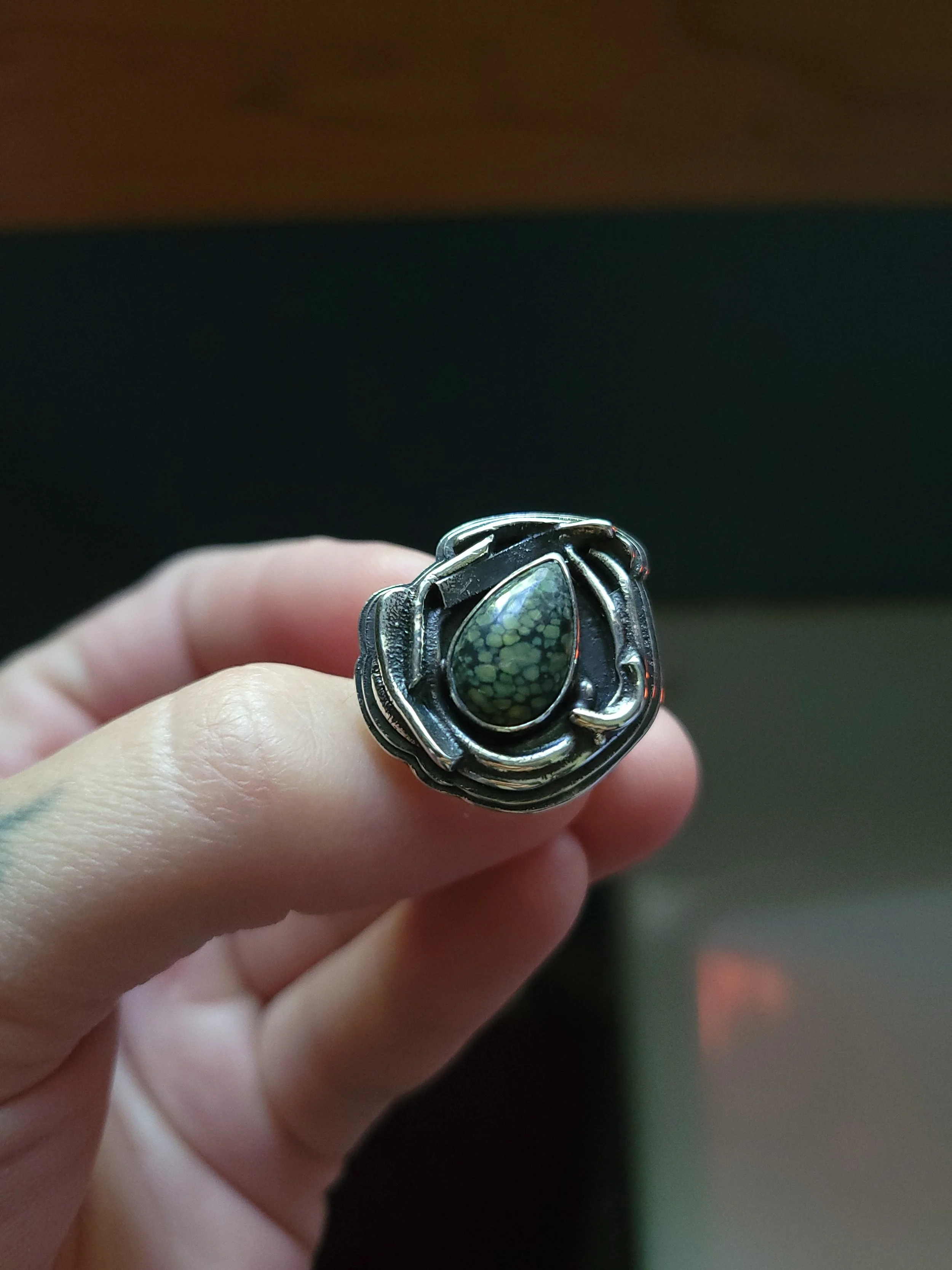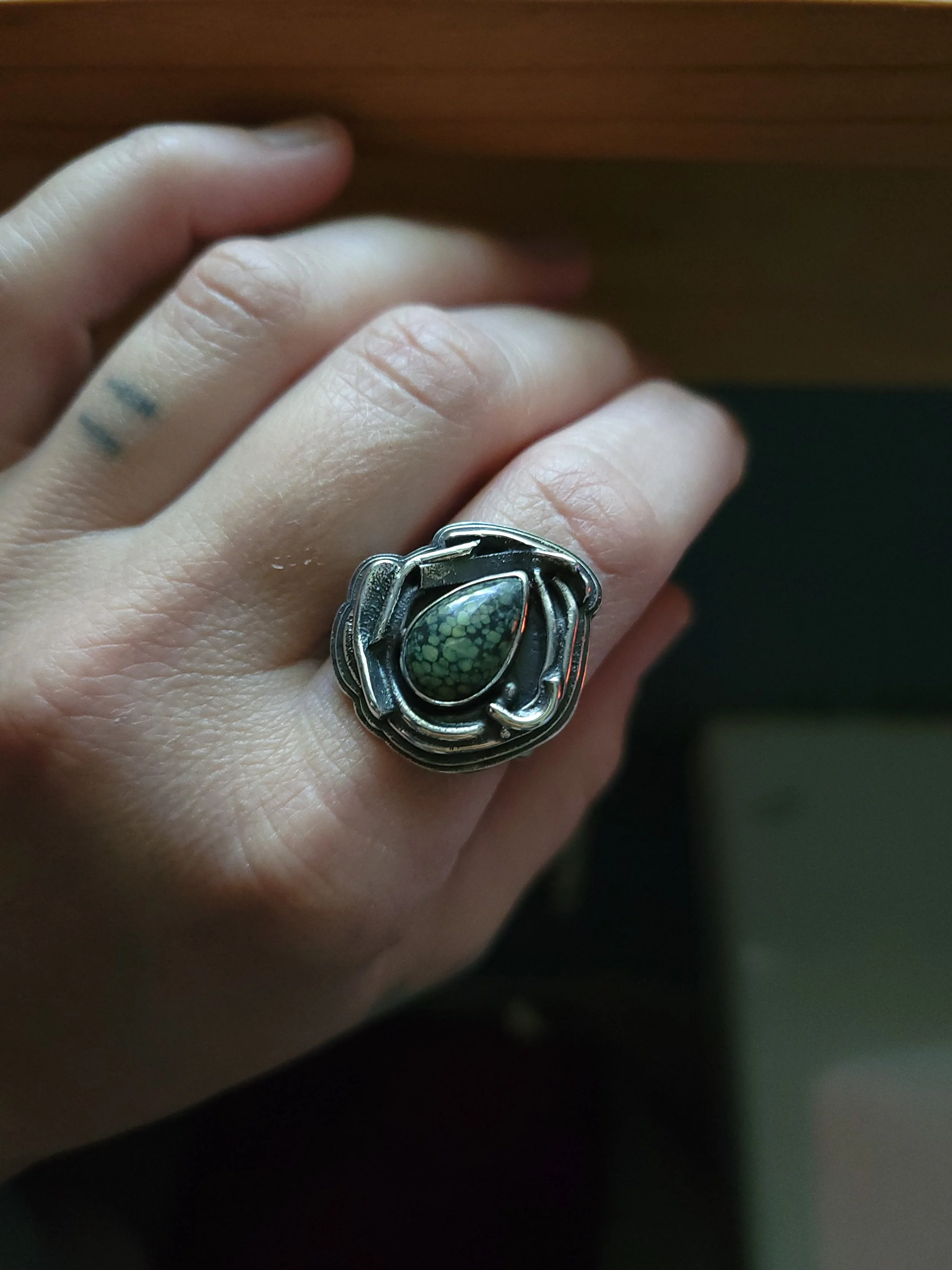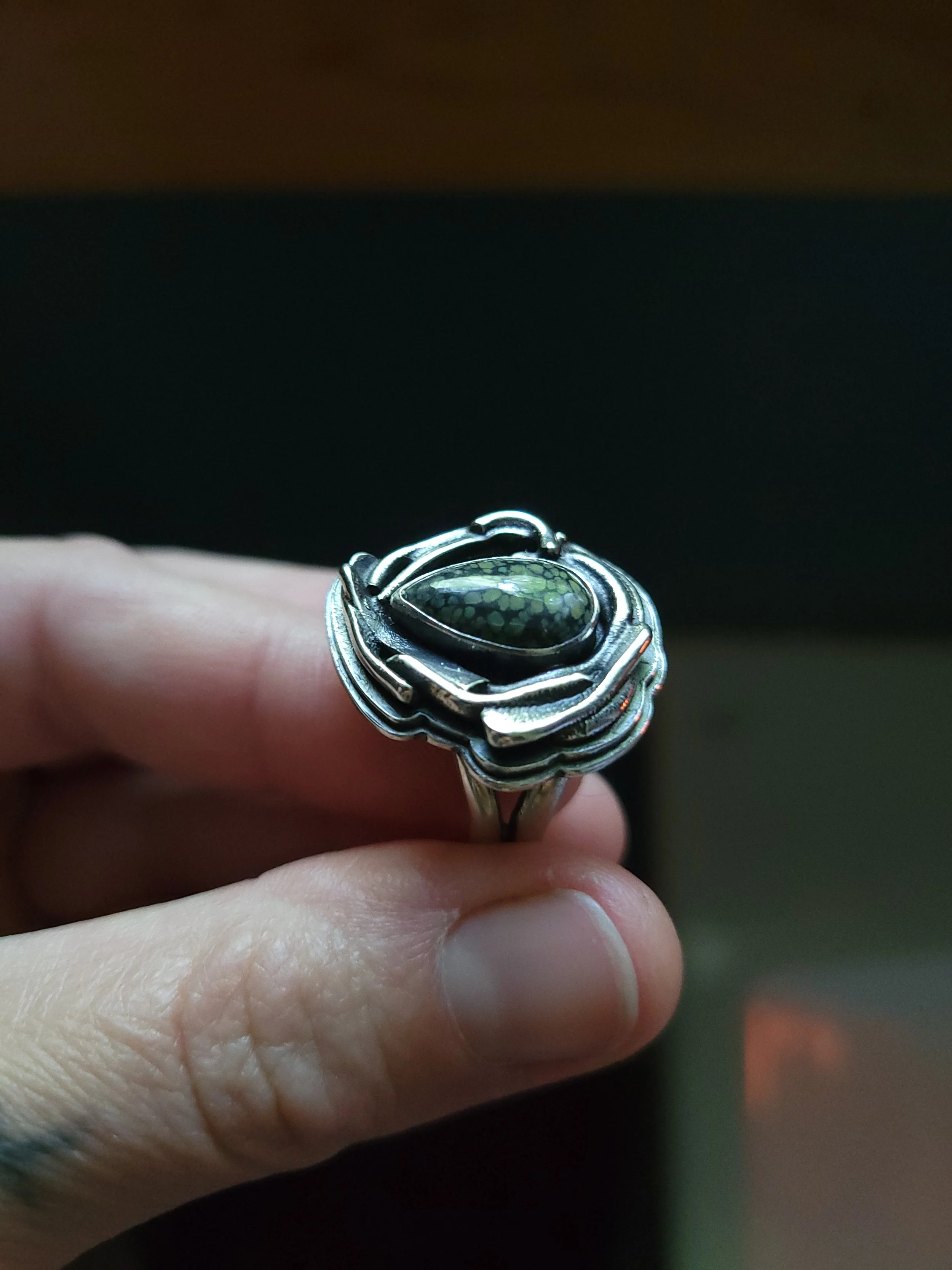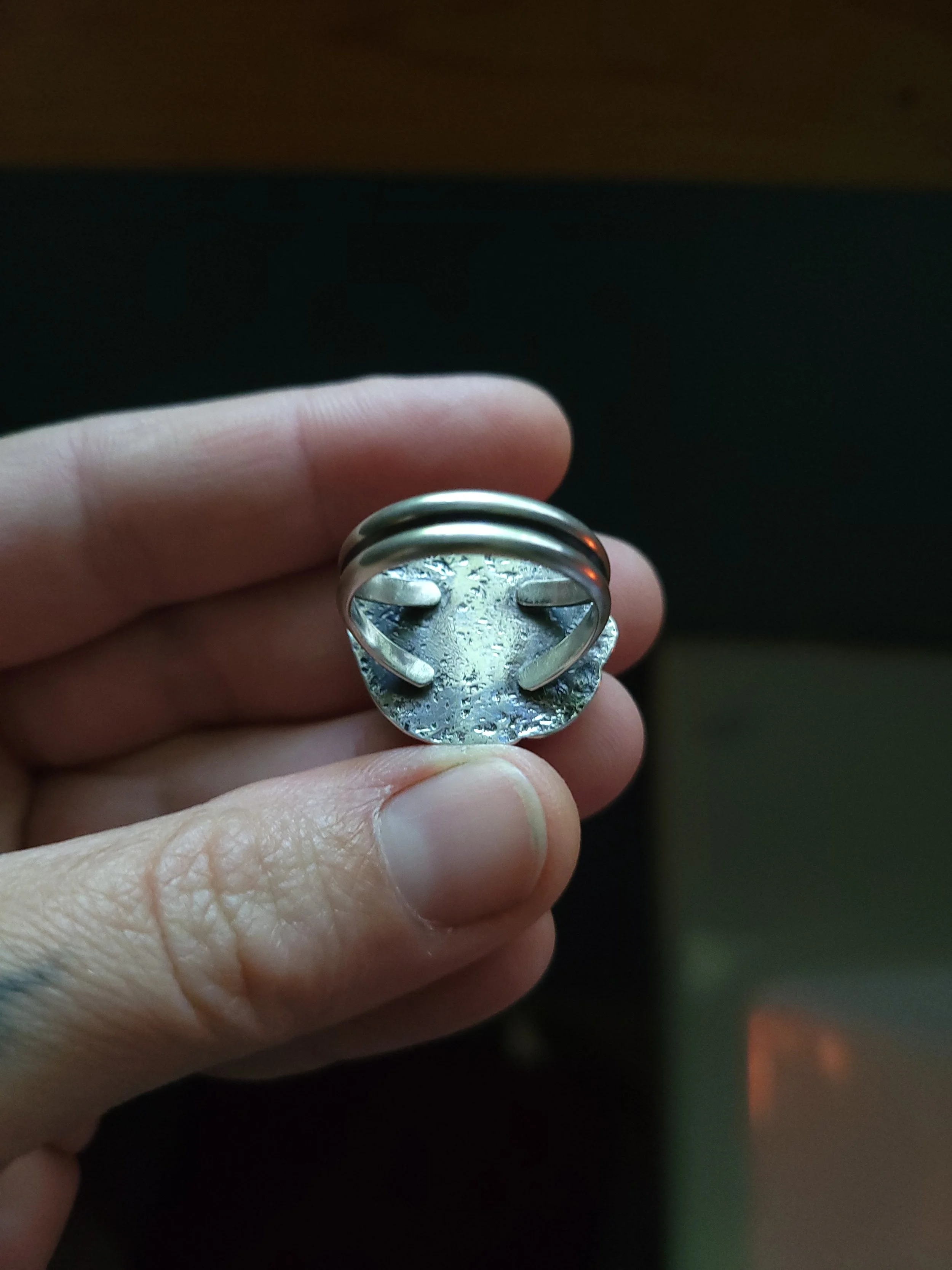 This ring was made by gathering scraps of silver and fusing them together and then finding a stone to fit in the negative space. This is the kind of work that makes my heart sing, because it's truly one-of-a-kind, and all the scraps come from a multitude of pieces that came before it. Unfortunately, the stone is a mystery, but whatever it is, it's pretty!